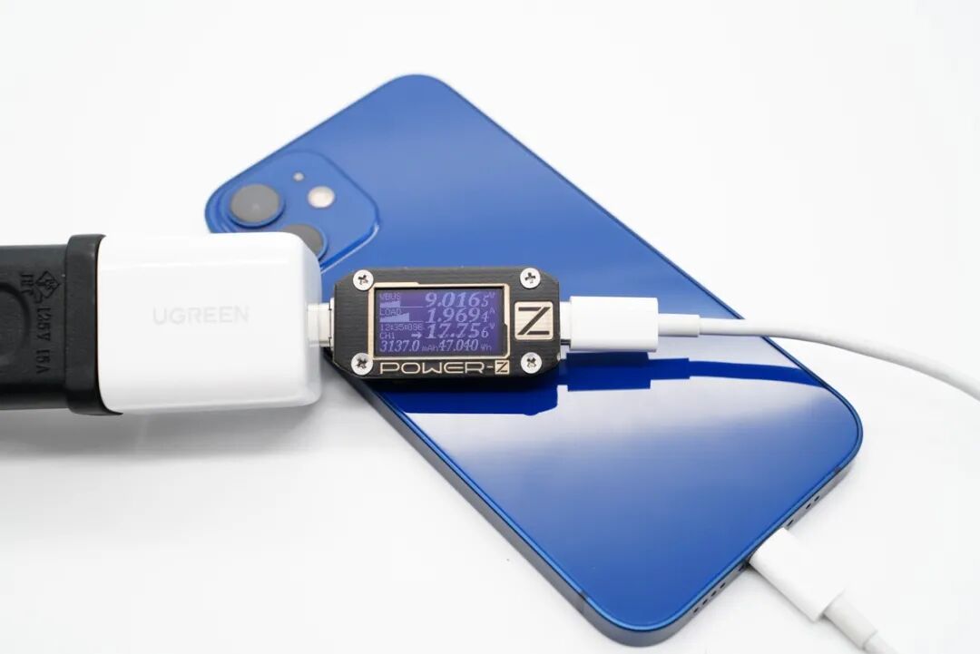 iPhone 12 mini支持PD/Apple2.4A快充协议,使用充电器为iPhone 12 mini充电,功率为9.01V 1.96A 17.75W。