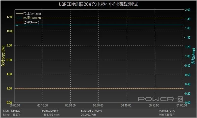 按照额定功率12V 1.67A 20W满载对充电器进行稳定性测试,测试时间为一小时,测试过程中电压值呈水平直线,无明显波动情况,长时间满载比较稳定。