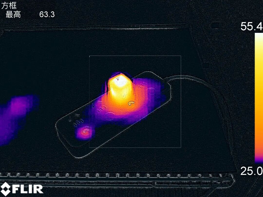 以20W的功率持续输出1小时后测得充电器表面最高温度为63.3℃。