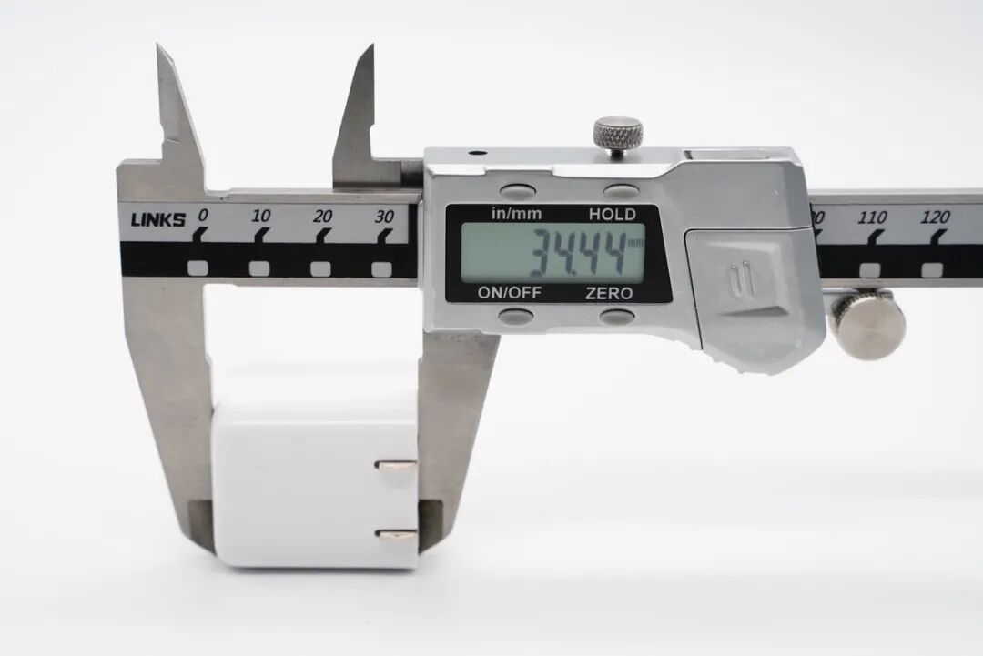 由此可以得出充电器的三围参数为34.44x30.17x30.14mm,充电器的体积约为31.31cm³,以最高输出20W计算,功率密度约为0.63W/cm³。