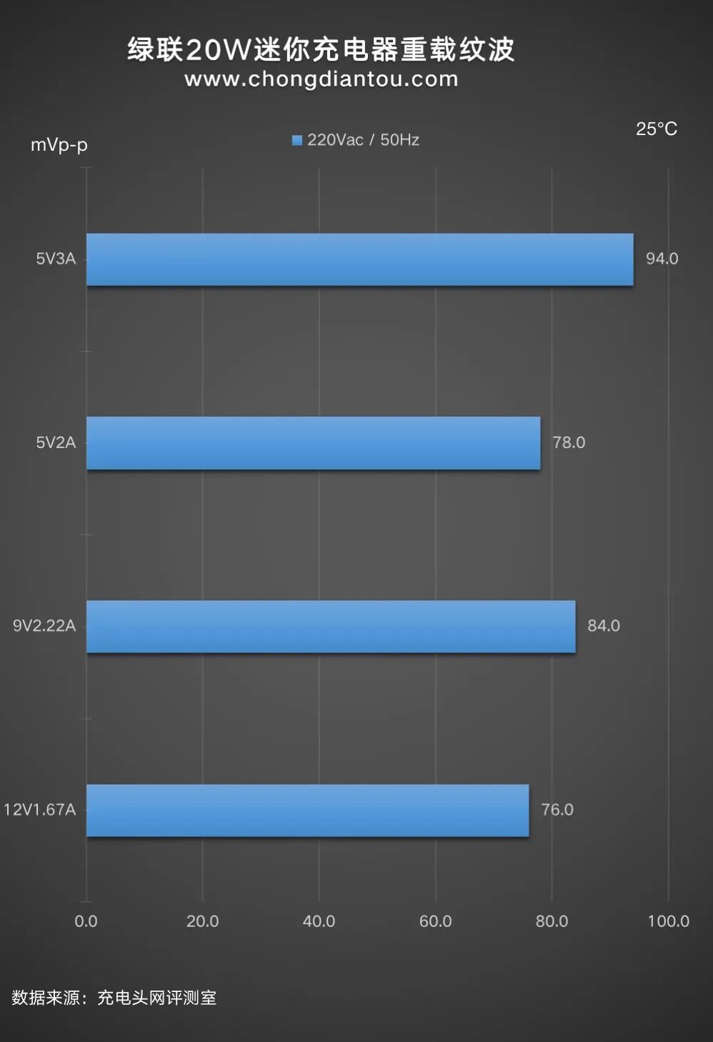 国家标准中充电器纹波要求是不高于200mVp-p,绿联20W迷你小金刚充电器在110V 60Hz、240V 50Hz输入电压下,所有输出功率纹波峰峰值均低于200mVp-p这个标准,表现不错。