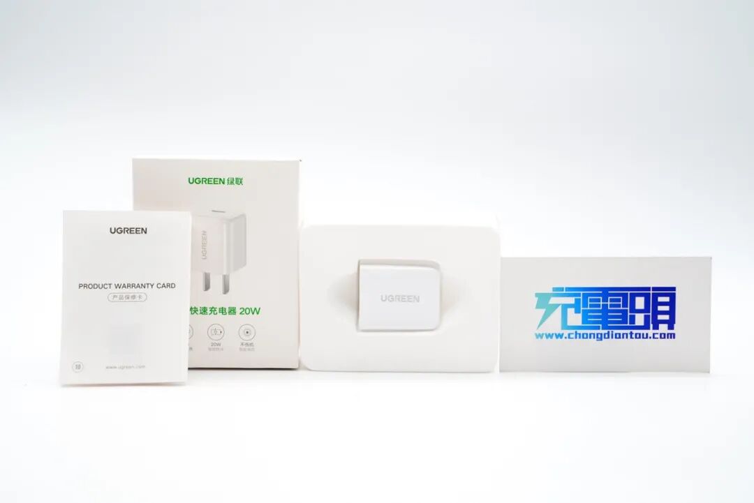 绿联20W迷你小金刚充电器的包装盒为白色,上面是熟悉的“UGREEN绿联”品牌Logo。