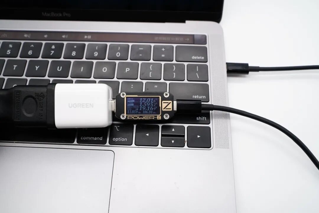 MacBook Pro支持USB PD快充协议,使用充电器为MacBook Pro充电,功率为12.01V 1.59A 19.16W。