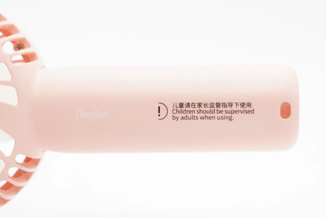 扇柄上除了印有“Benks”的品牌Logo外还有注意事项标注:儿童请在家长监督下使用。