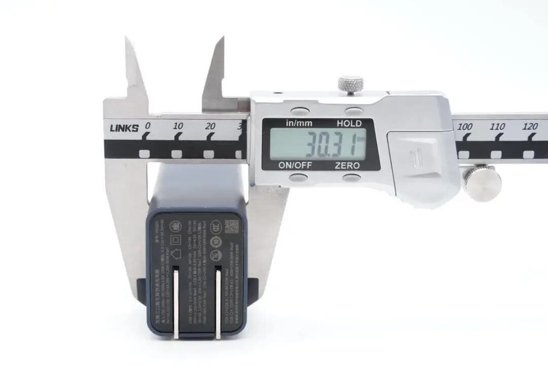 可以知道充电器的三围为30.31mm*40.69mm*65.70mm,计算出体积为81.03cm³。以最大输出65W算,功率密度约为0.80W/cm³。