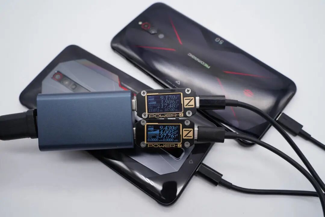 使用充电器两个C口同时输出进行充电测试,USB-C1为红魔5 S 充电,输出功率为9.17V/1.90A,17.48W;USB-C2为红魔6 Pro 充电,输出功率为9.43V/4.00A,37.76W。合计输出55.24W,充电器支持为两台设备同时快充。