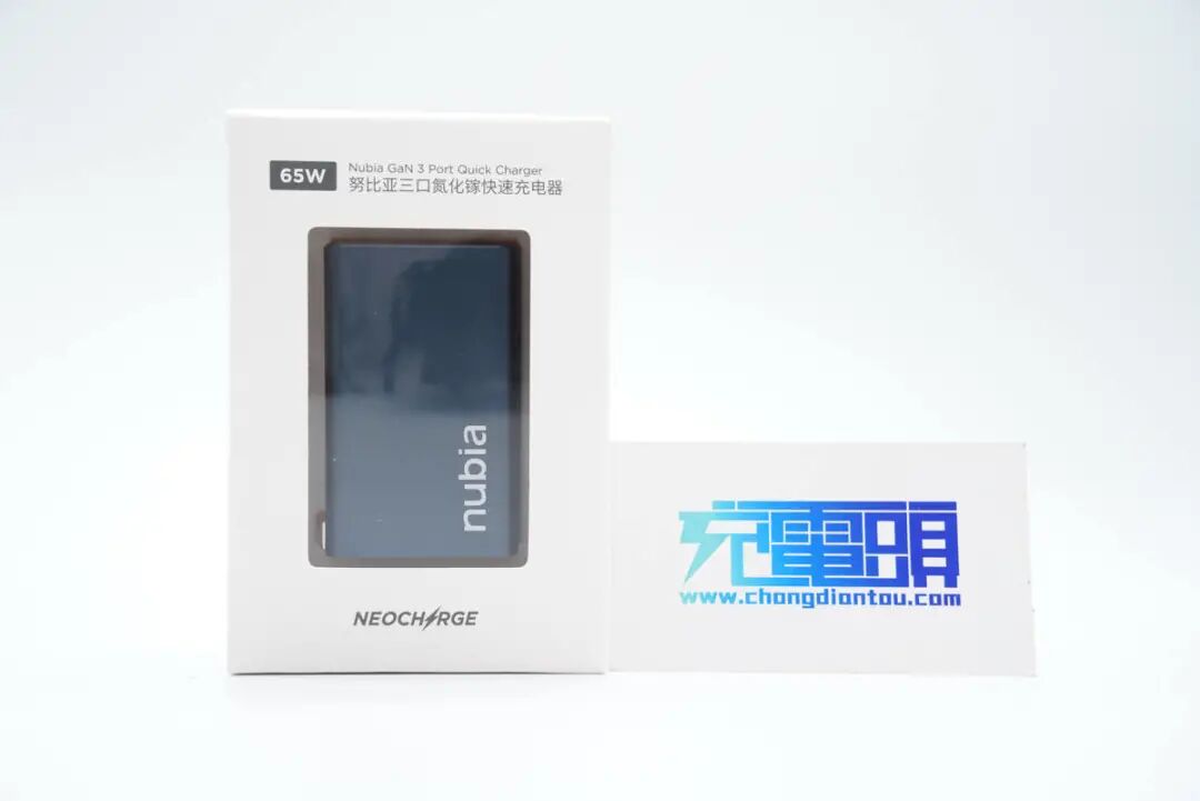 努比亚65W三口氮化镓充电器包装正面为白色,很简洁。透明天窗设计,展示产品的同时补足包装正面的logo。