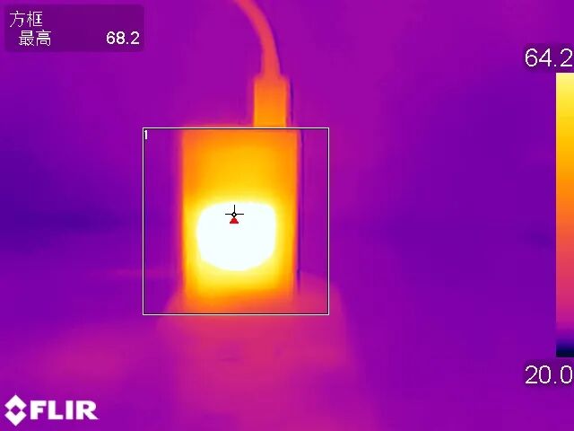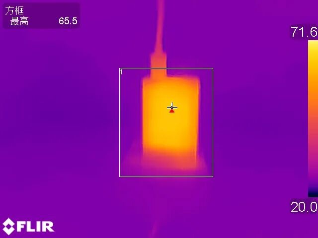 充电器使用温度事关充电安全,过高的温度不仅可能伤害人身财产安全,也有可能会降低充电效率。将充电器置于25℃恒温箱内,以充电器最大功率65W持续输出进行一小时温升测试。