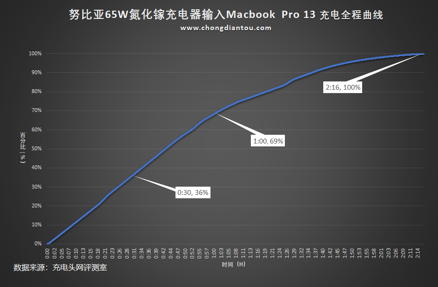 将充电时间和笔记本电量绘制成曲线图,可以很直观的看出努比亚65W三口氮化镓充电器半小时为Macbook Pro 13 充入36%电量;一小时充入69%电量;全程充电耗时为2小时16分。