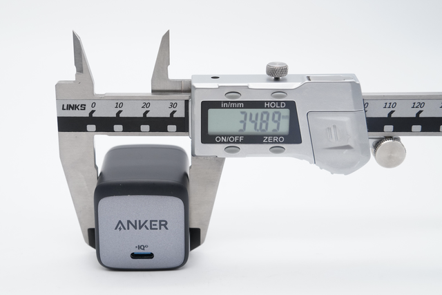 使用卡尺实测充电器的宽度约为 34.89mm。