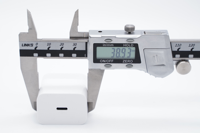由此可以得出充电器的三围参数为 41.12 x 38.93 x 26.84mm,充电器的体积约为 42.96cm³,以最高输出 20W 计算,功率密度约为 0.46W/cm³。