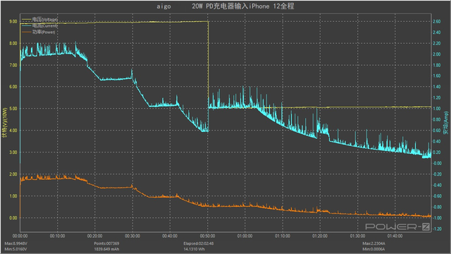 使用 aigo 20W 充电器为 iPhone 12 充电,约 15 分钟前功率在 18W 左右,随后功率和电流开始呈阶梯式的下降状态。21 分钟到 30 分钟功率在 14W 左右;34 分钟到 41 分钟功率在 10W 左右。随后功率和电流开始逐渐降低直至充电结束,50 分钟时电压由 9V 降至 5V 输入,电流上升,不过功率基本没有变化,全程耗时约 1 小时 47 分,最高功率为 8.90V 2.23A 19.85W。