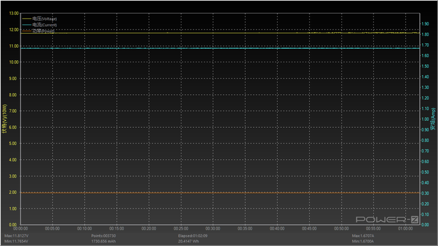 按照额定功率 12V 1.67A 20W满载对充电器进行稳定性测试,测试时间为一小时,测试过程中电压值呈水平直线,无明显波动情况,长时间满载比较稳定。