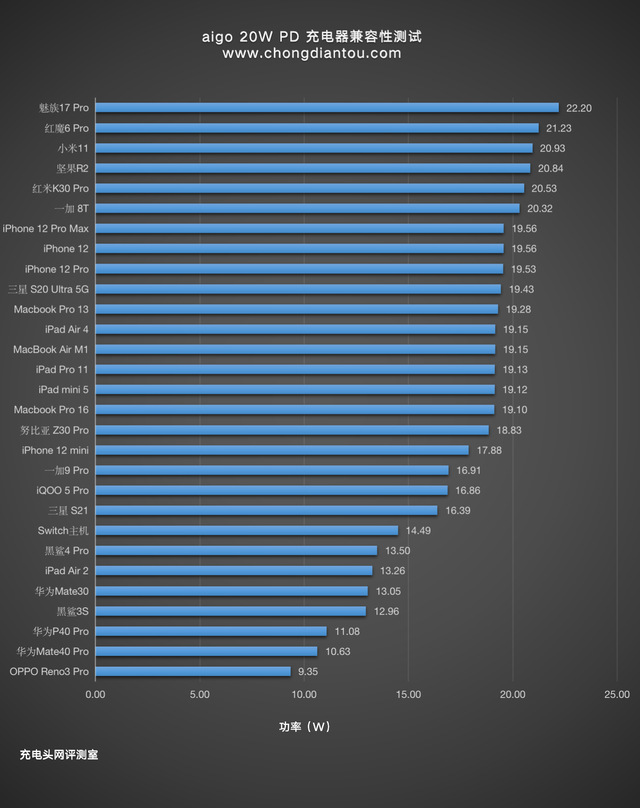 将所有的测试数据汇总,平板、笔电均可以触发 PD 快充,功率在 19W 以上,iPhone 手机可以触发 20W 快充,对于其他安卓手机的快充支持均不错,暂未发现不兼容的情况。
