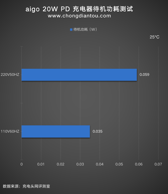 经过功率计测试,aigo 20W PD 充电器在220V 50Hz的空载功耗为 0.059W,换算下来一年损耗的电能约为 0.51KW·h,若市价电为 0.6元/KW·h,则充电器一年的空载功耗约为 0.3 元左右。