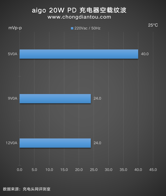 aigo 20W PD 充电器在 220V 50Hz 交流输入的情况下进行了空载与重载的纹波测试,测试结果如下: