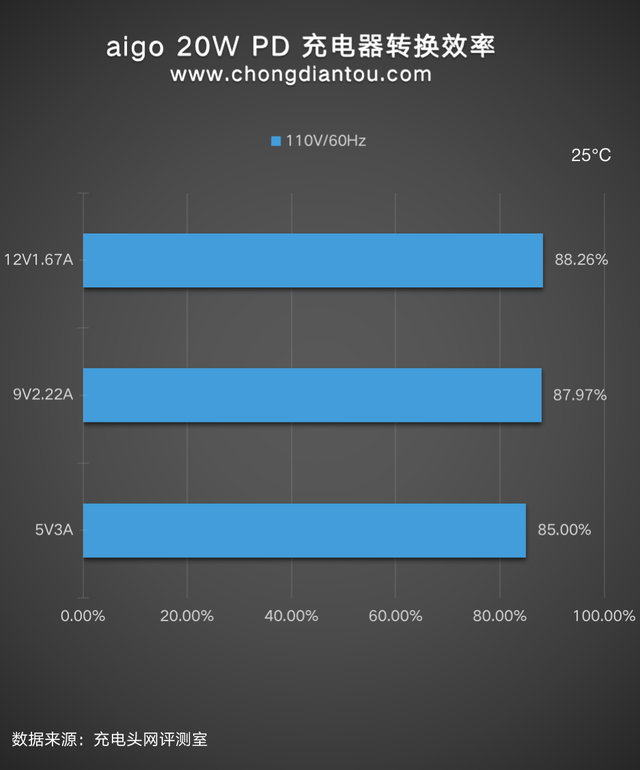 110V 60Hz 下,充电器的转换效率从 85% 到 88.26% 不等。