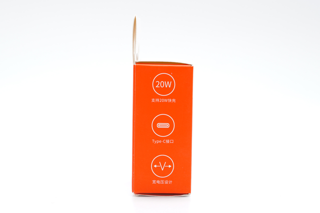 侧面可以看出这款快充头具备的特点,支持 20W 快充、USB-C 接口、宽电压设计。