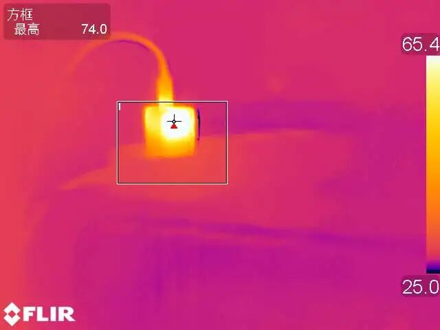 以 30W 的功率持续满载输出 1 小时后采集到充电器表面的最高温度为 74℃。