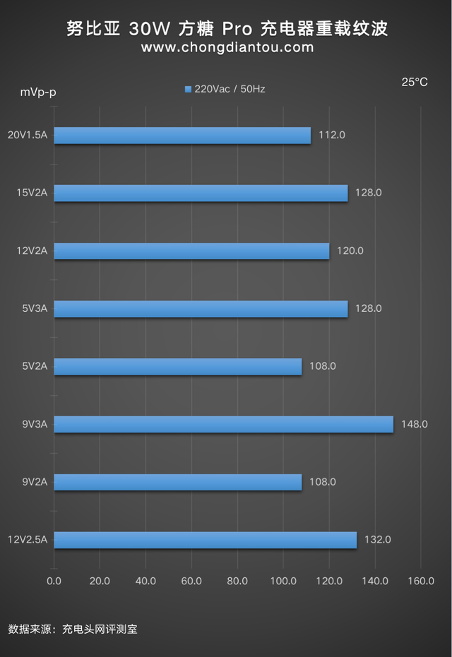 国家标准中充电器纹波要求是不高于200mVp-p,努比亚 30W 方糖 Pro 氮化镓充电器在110V 60Hz、220V 50Hz输入电压下,所有输出功率纹波峰峰值均低于200mVp-p这个标准,表现不错。