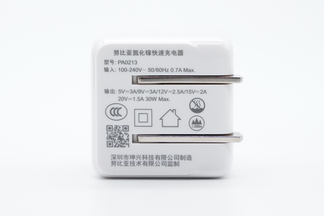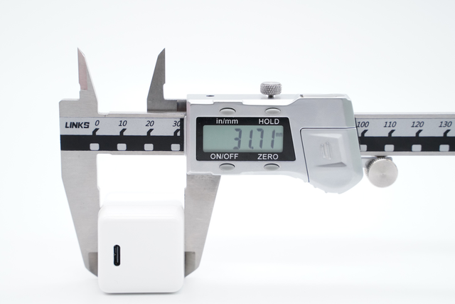 可以得出充电器的三围参数为33.51 x 31.71 x 31.67mm,体积约为33.65cm³,以最高输出30W计算,功率密度约为 0.89W/cm³。