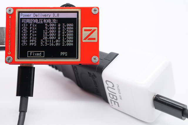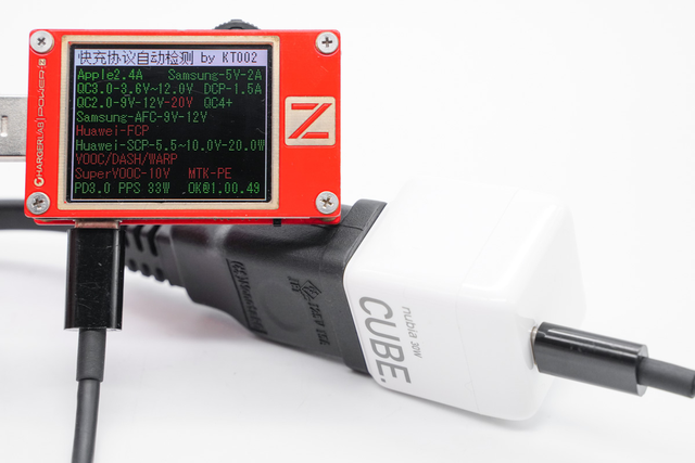 使用 ChargerLAB的 POWER-Z KT002 读取充电器的快充协议,实测支持 PD、PPS、Apple2.4A、QC2.0、QC3.0、QC4+、AFC、SCP 等快充协议。