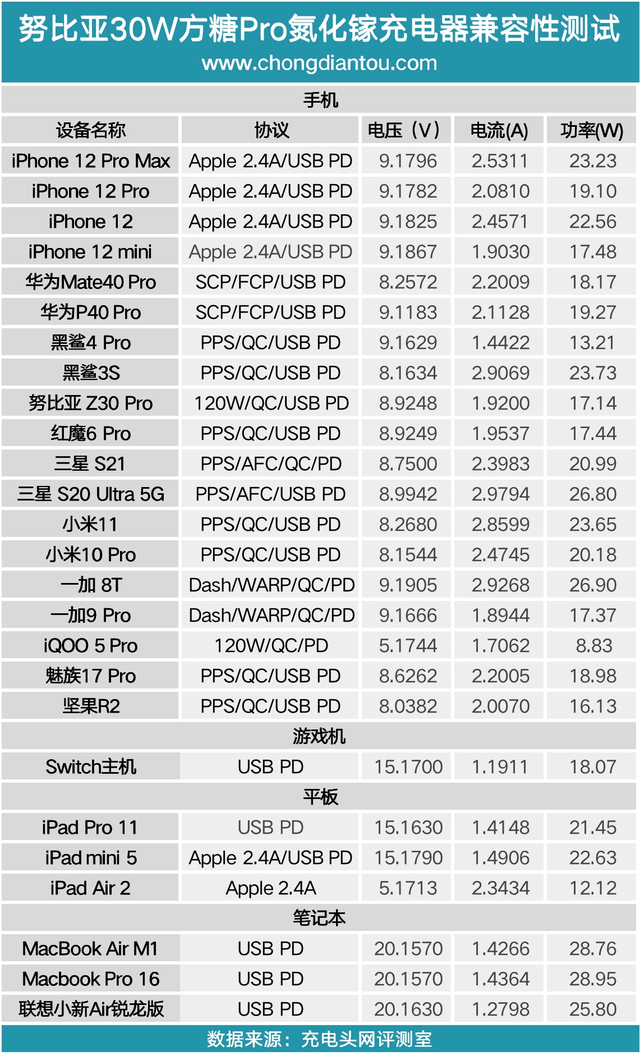 将测试数据汇总,整体来看对 iPad 和笔电均可以提供 15V 或20V 的高压快充档位,得益于 PPS 快充的加持,在为小米三星手机充电时可以提供大功率充电,整体表现不错。