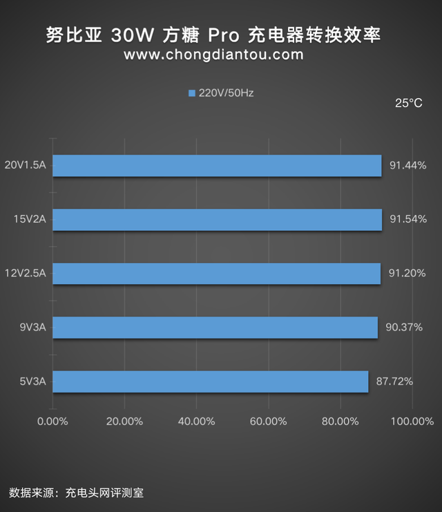 我们平时看充电器上面的参数输出100W或者65W是充电器可以为设备提供的最大输出功率,但充电器从插座上汲取的功率往往要更大一些,下面是努比亚 30W 方糖 Pro 氮化镓充电器在220V 50Hz和110V 60Hz交流输入的情况下分别进行了转换效率测试,测试结果如下: