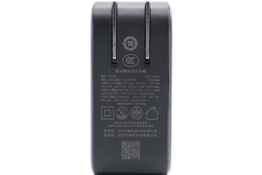 以上是绿联 100W 氮化镓充电器的全部参数,可以看出 USB-C1/C2 专为笔记本准备,而 USB-C3 面向的则是手机,USB-A 中的4.5V5A、5V4.5A 两个档位相信大家都不陌生,支持华为 SCP 22.5W 低压直充。