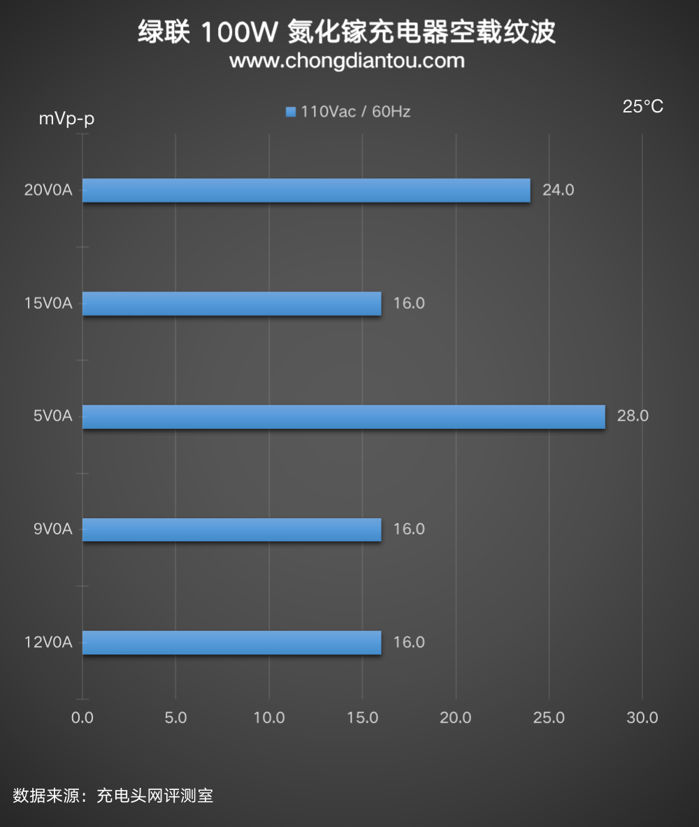 国家标准中充电器纹波要求是不高于200mVp-p,UGREEN 绿联 100W 氮化镓充电器在110V 60Hz、240V 50Hz输入电压下,所有输出功率纹波峰峰值均低于200mVp-p这个标准,表现不错。