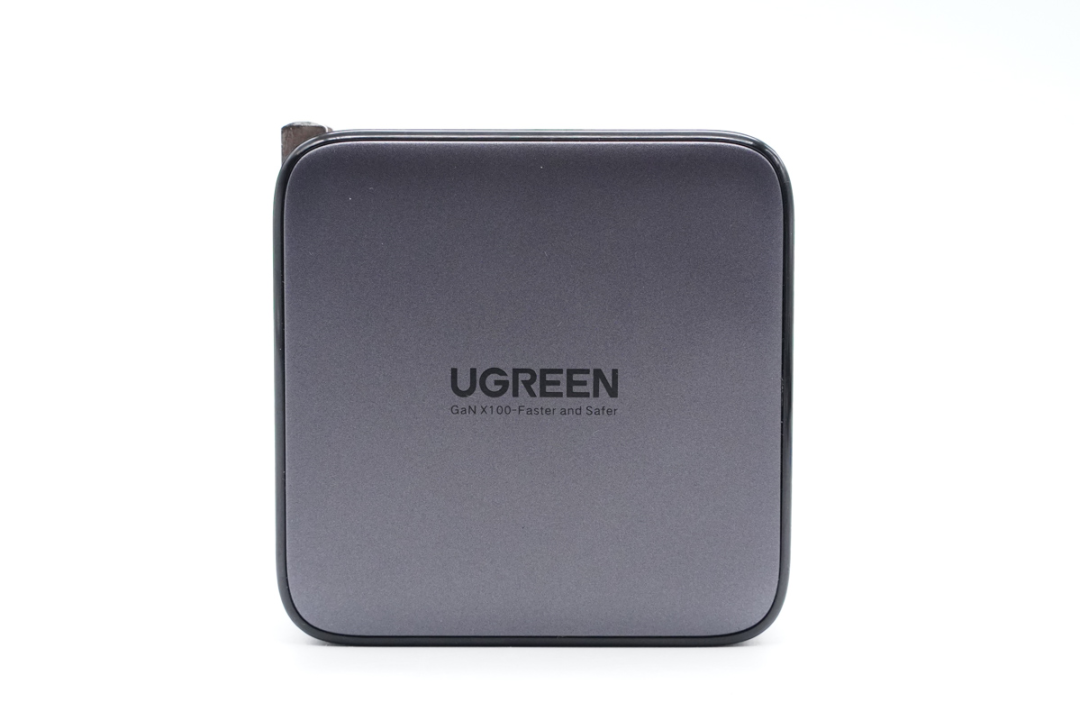 说回充电器,壳体采用黑灰色的外观配色,整体造型较为方正,正面印制着‘UGREEN’的品牌 Logo和产品型号。