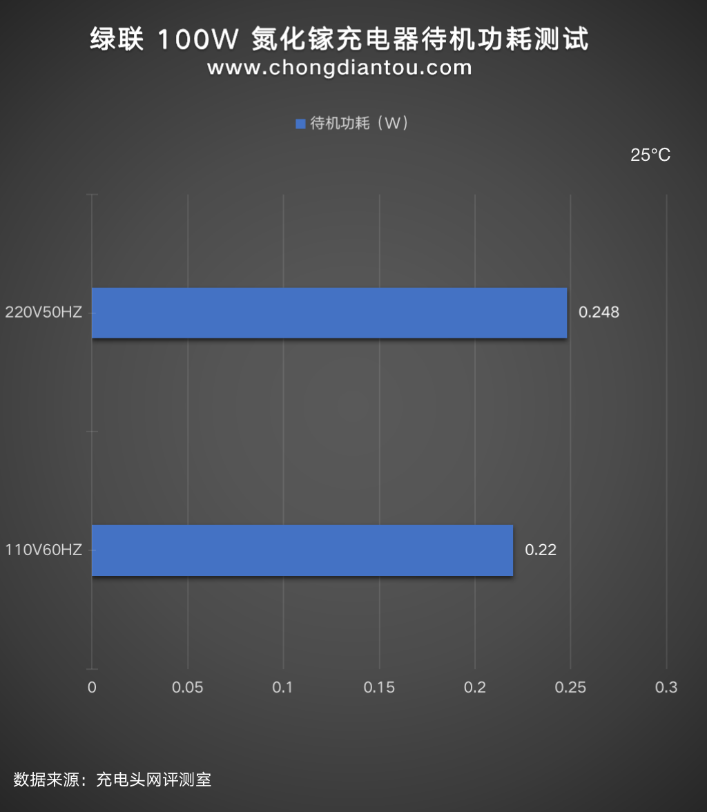 110V 60Hz 时的空载功耗为 0.22W,换算下来,一年损耗的电能约为 1.92KW·h,若市价为 0.6元/KW·h,则充电器一年的空载功耗约为 1.15 元左右。