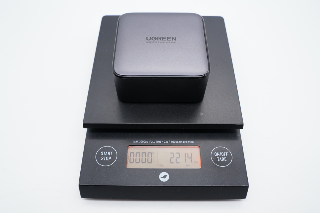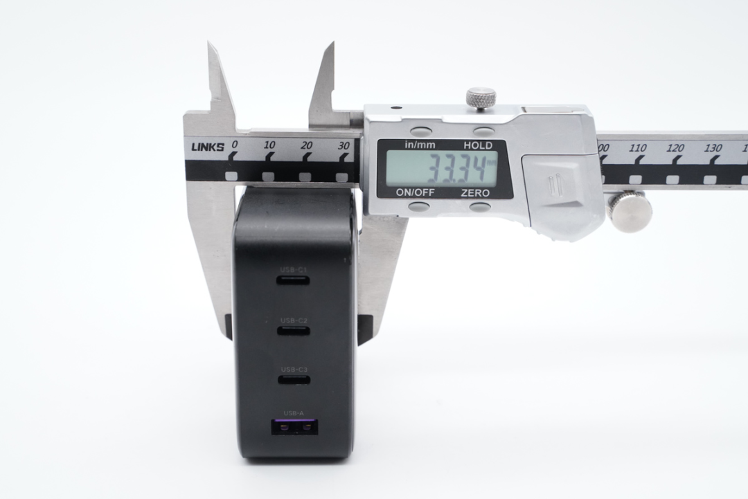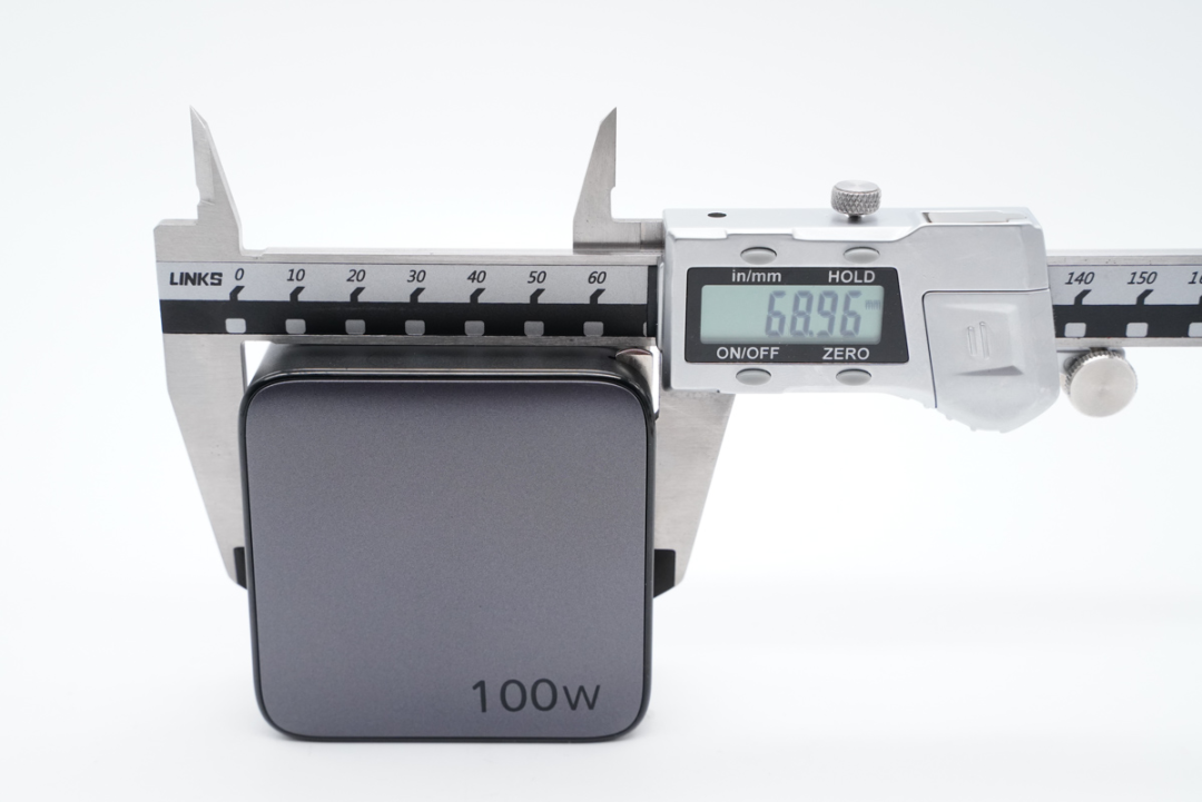 充电器的三维参数约为 68.85 x 68.96 x 33.34mm,充电器的体积约为 158.29cm³,以最高输出100W计算,功率密度约为0.63W/cm³。