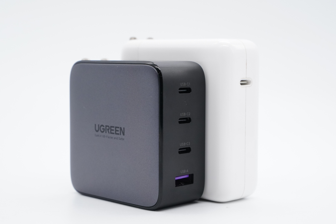 和苹果 96W PD 充电器放在一起对比,体积更小、功率更大、接口更多。