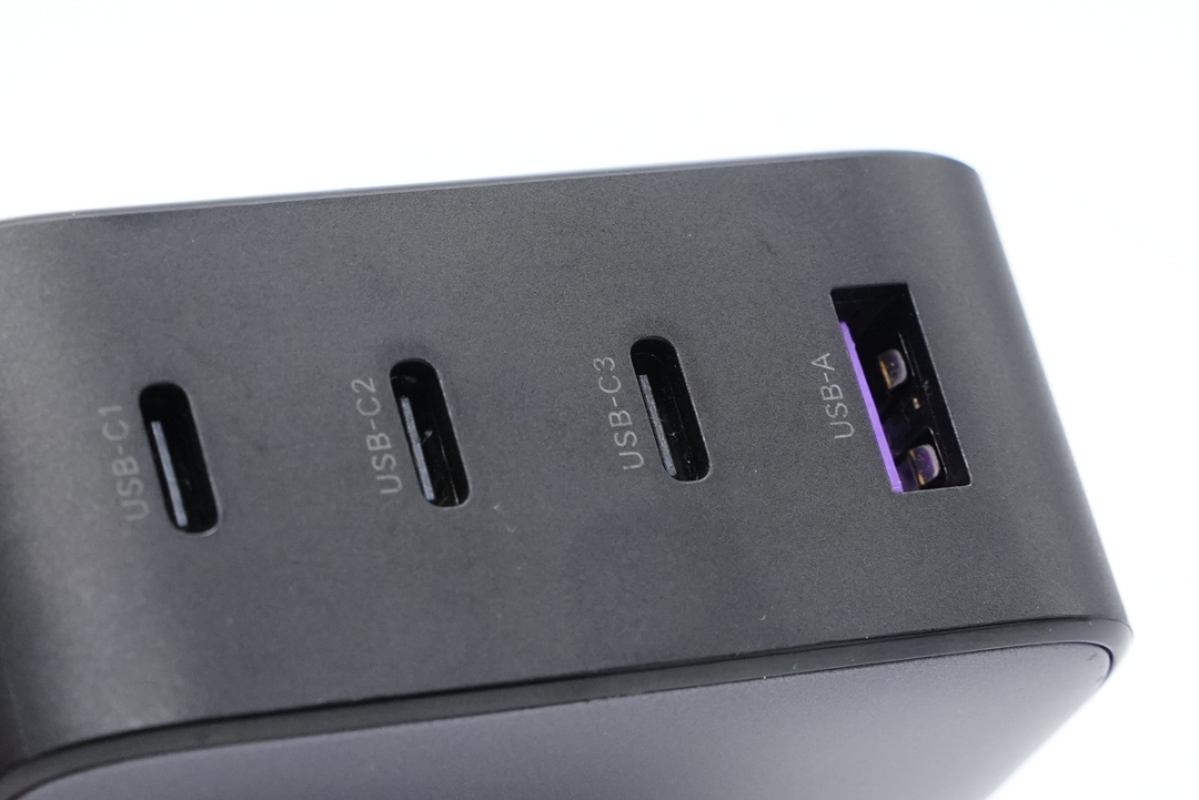 UGREEN 绿联的这款 100W 氮化镓充电器机身配备 3C1A 共 4 个 USB 充电接口,4 个接口依次排列,每个接口上面标注接口名称方便识别。