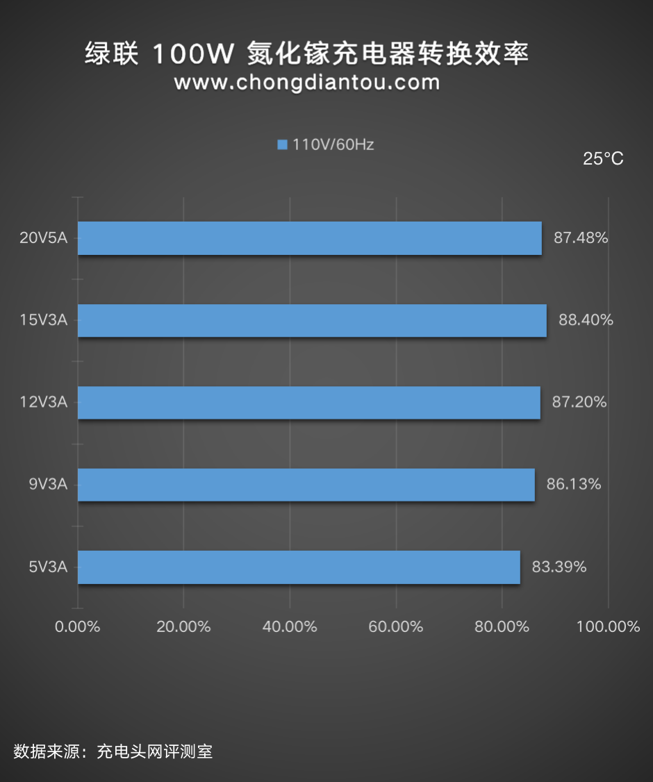 110V 60Hz 下,充电器的转换效率从 83.39% 到 87.48%不等。