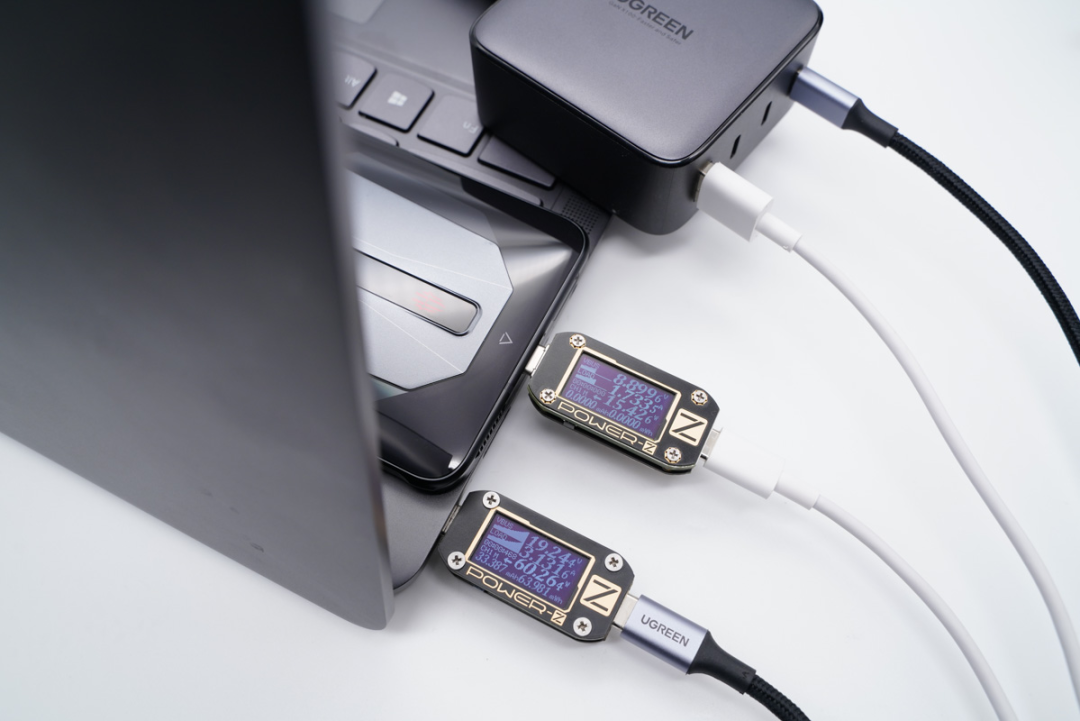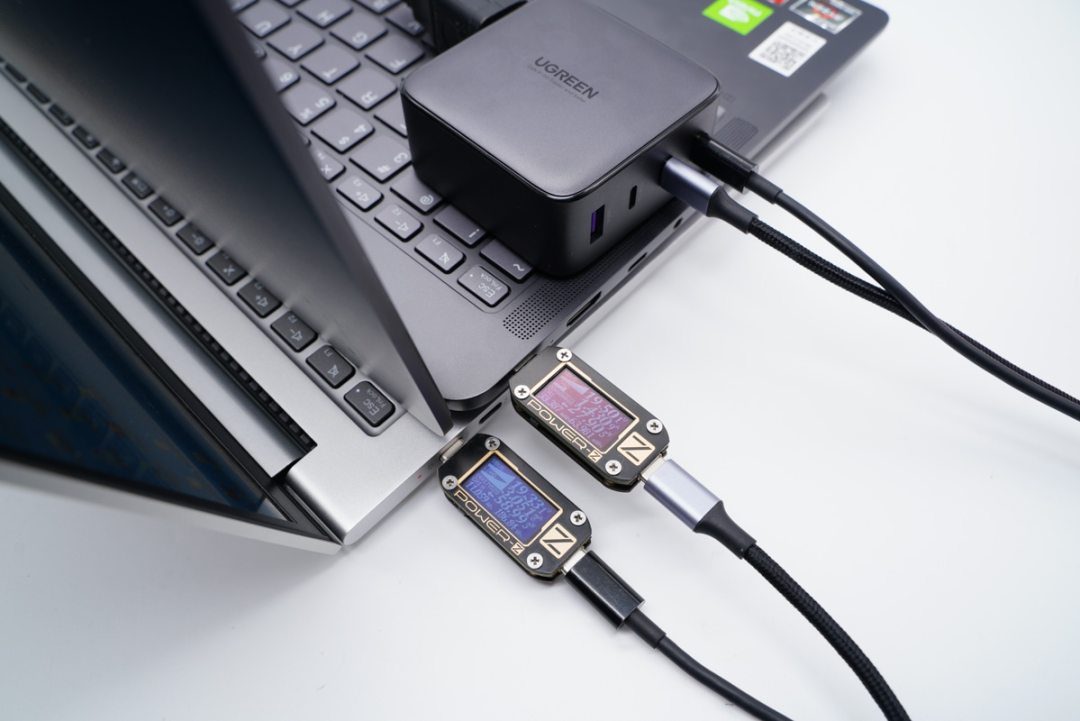 使用 USB-C1 和 USB-C2 同时为2 台笔记本充电,功率分别为 58.99W 和 29.90W。充电器支持 USB-C1 和 USB-C2 同时输出,功率分配规则为 60W+30W。