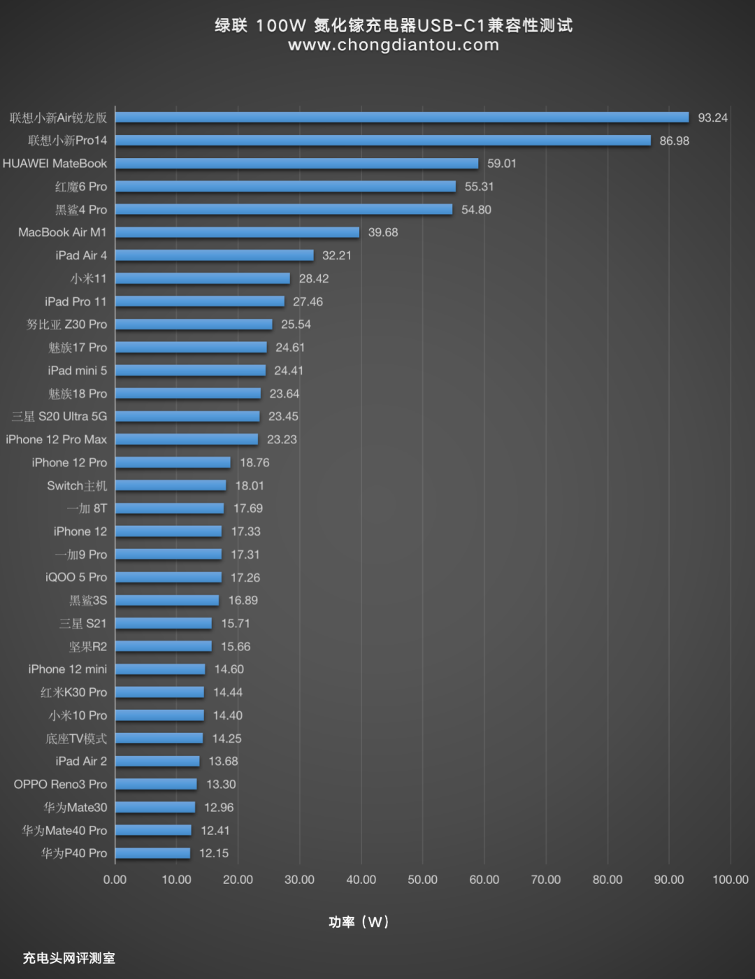 USB-C1 支持 100W 快充,所以整体来看笔记本的功率柱状图自然领先。其他手机以及平板的柱状图走向较为平缓,不过均处于快充状态。