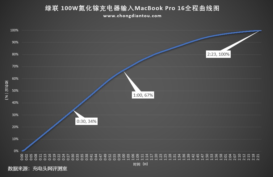 将测试数据绘制成曲线图,可以看出绿联 100W 氮化镓充电器为 MacBook Pro 16 半小时充电 34%,1 小时充电 67%,完全充满需要 2 小时 23 分。
