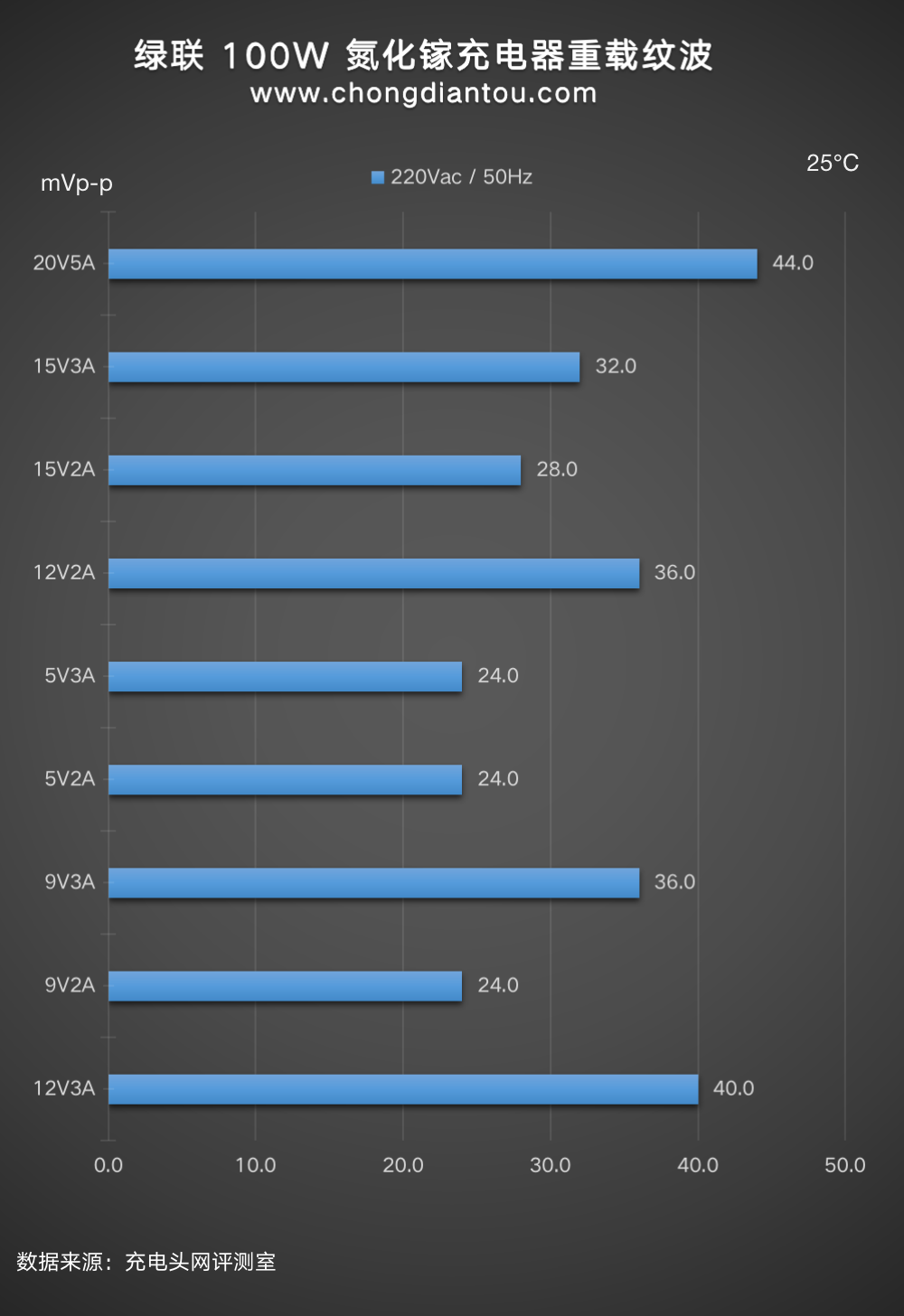 重载情况下:九个档位输出时纹波峰峰值从 24mVp-p 到 44mVp-p 不等。