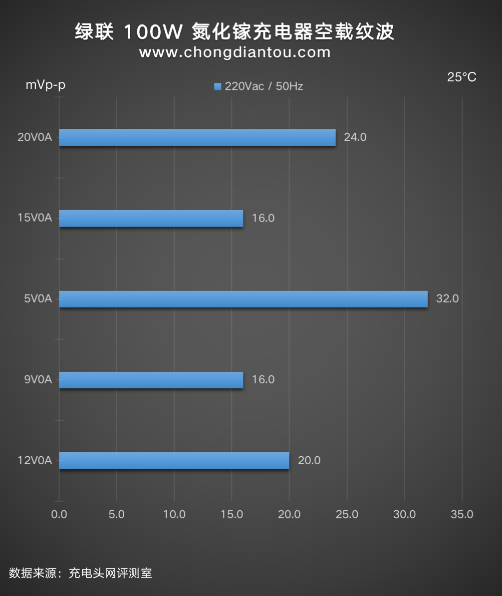 空载情况下:五个档位输出时纹波峰峰值从 16mVp-p 到 32mVp-p 不等。