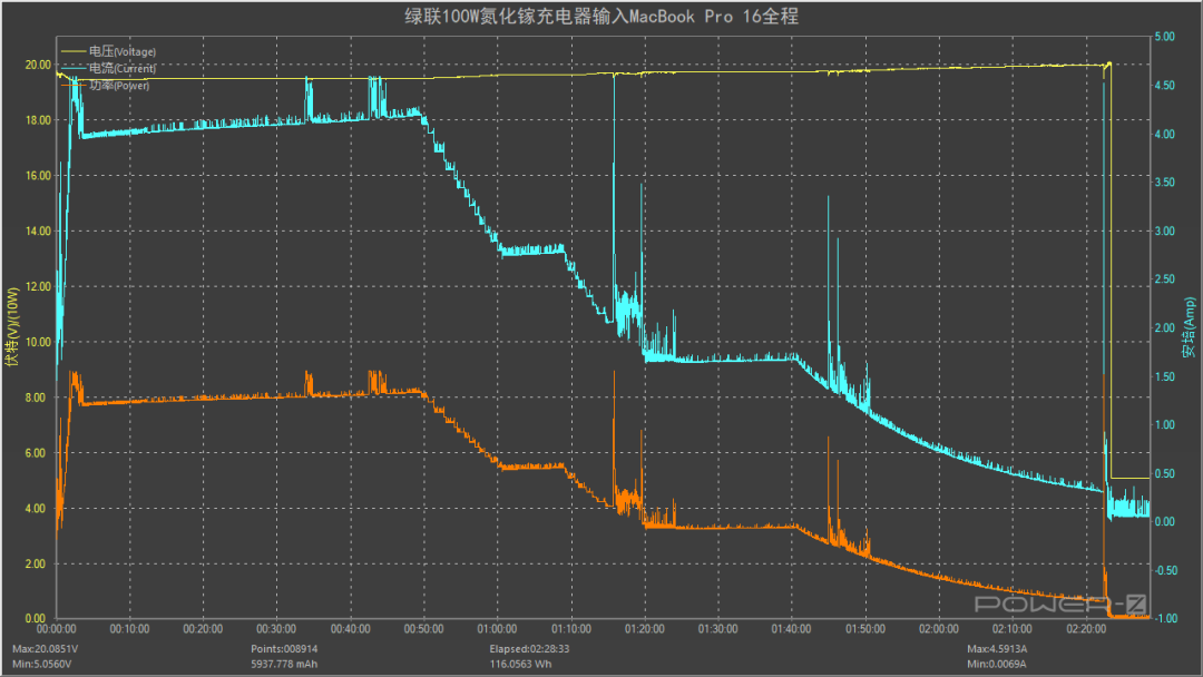 使用 USB-C1 为 MacBook Pro 16 充电,连接充电器之后功率开始上升,约 50 分钟前功率稳定在 80W 左右,随后功率开始呈阶梯式的下降状态,全程耗时约 2 小时 23 分,最高功率为 19.42V 4.59A 89.17W。
