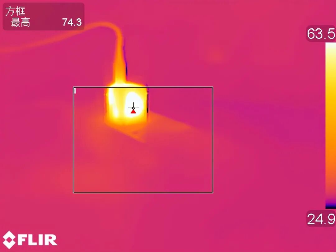 按照惯例充电器以 20W 的功率持续满载输出 1 小时后采集到充电器表面最高温度为 74.3℃。