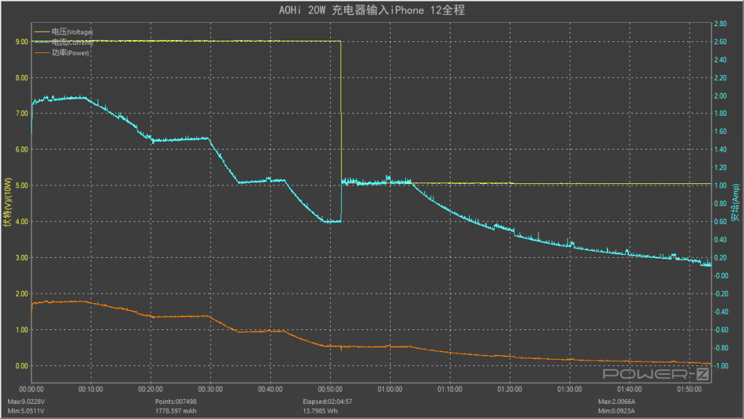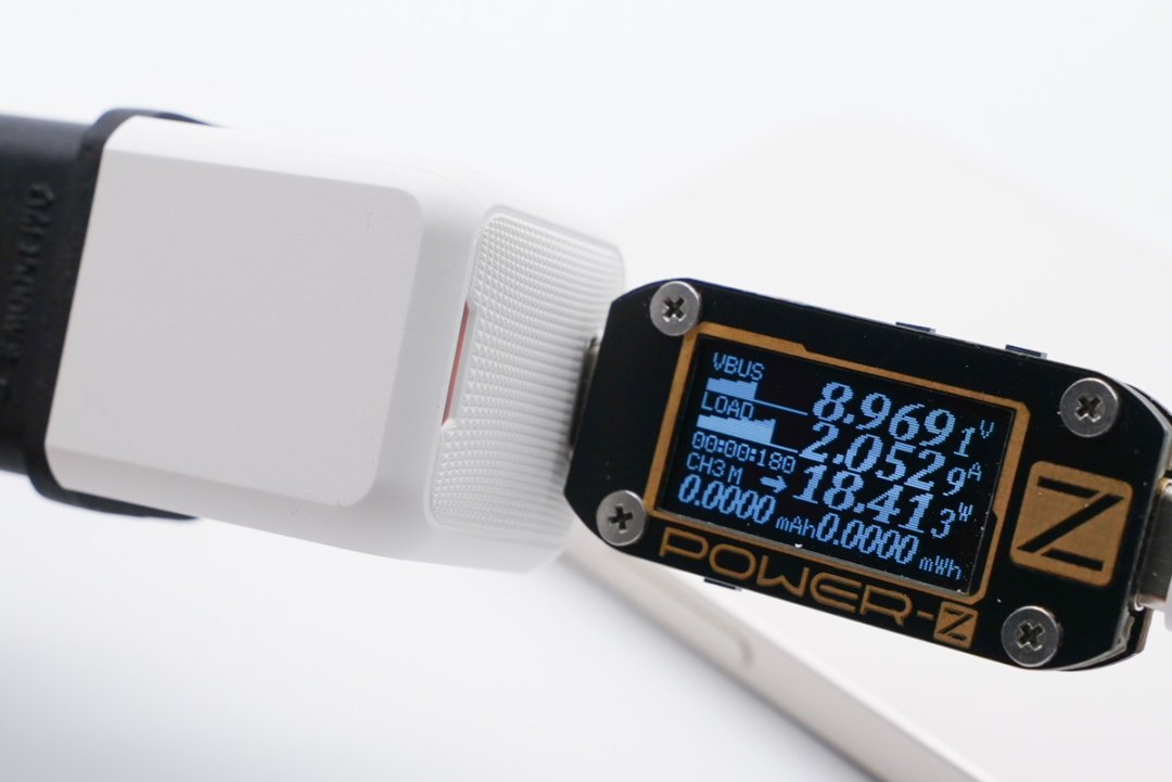 随后功率持续走低直至充电结束,51 分钟时电压由 9V 降至 5V 输入,全程耗时约 1 小时 52 分,最高功率为 9V 1.99A 18W。