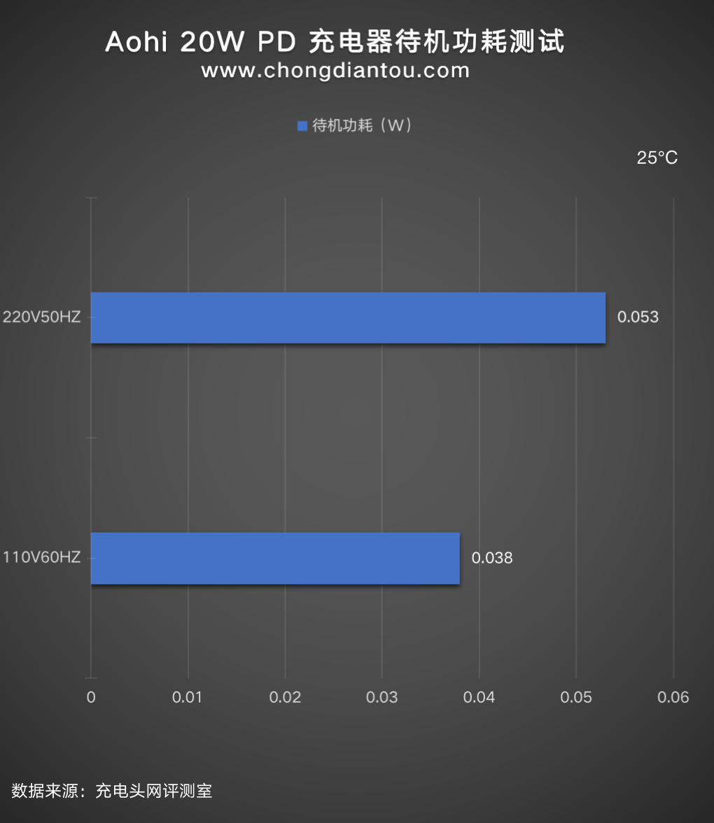 经过功率计测试,Aohi 20W 充电器在220V 50Hz的空载功耗为0.053W,换算下来一年损耗的电能约为 0.46KW·h,若市价电为0.6元/KW·h,则充电器一年的空载功耗约为0.27元左右。