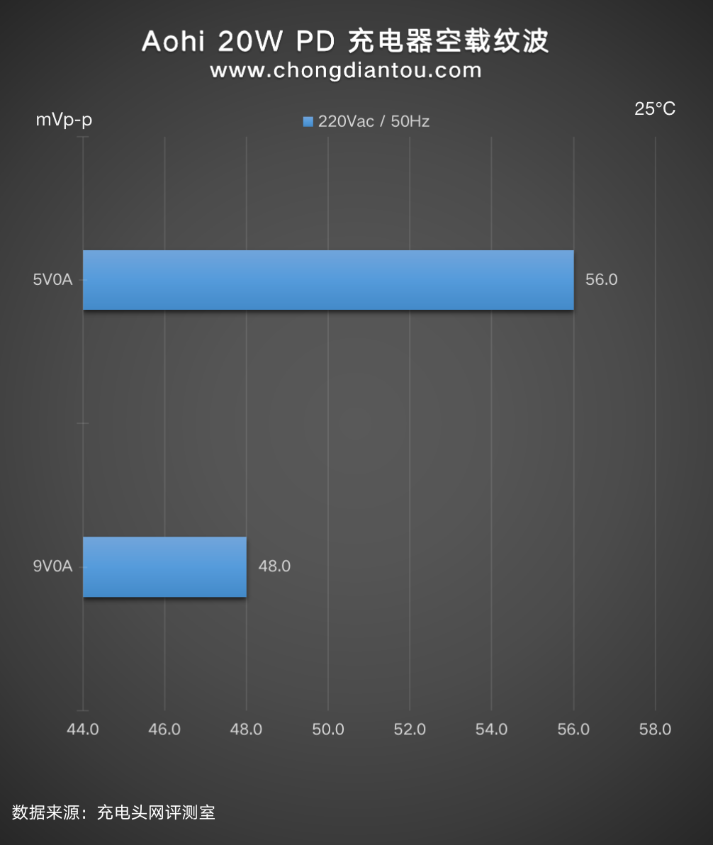 国家标准中充电器纹波要求是不高于200mVp-p,Aohi 20W 充电器在110V 60Hz、240V 50Hz输入电压下,所有输出功率纹波峰峰值均低于200mVp-p这个标准很多,表现不错。