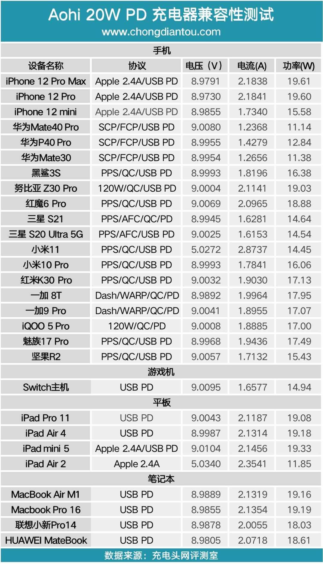 将测试数据汇总,充电器支持最高 9V 高压输出,参与测试的设备基本都可以触发快充状态,整体兼容性不错。