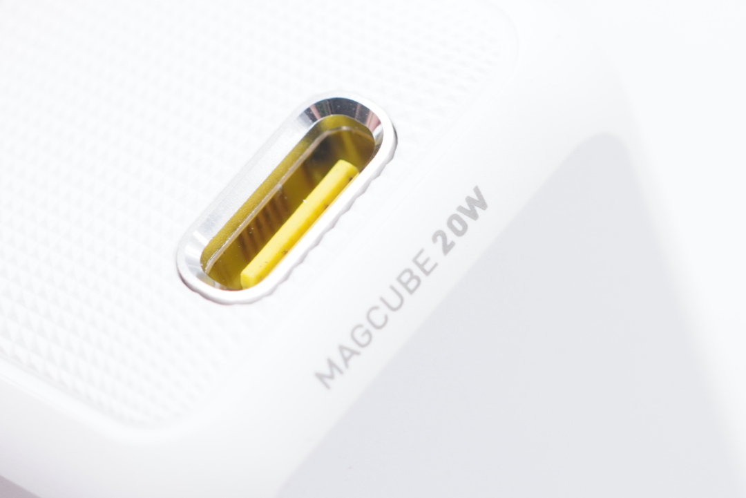 USB-C 接口自带金属圈的设计在 20W 充电器上面已经不多见了,金属圈可以帮助接口在经历了长时间的插拔之后依旧洁净,不会出现发黑的情况。内舌为黄色,符合快充的特征。下方带有“MAGCUBE 20W”的标识,意为支持 20W 快充。
