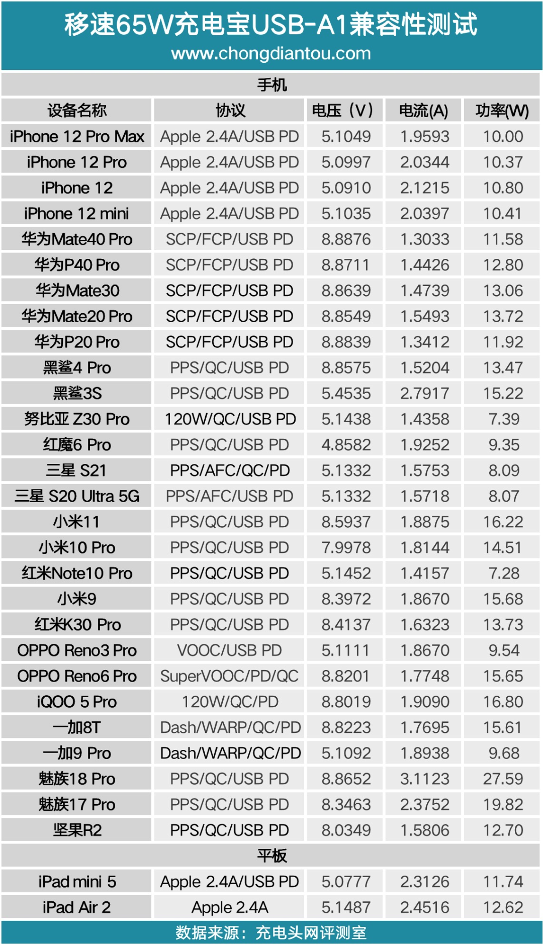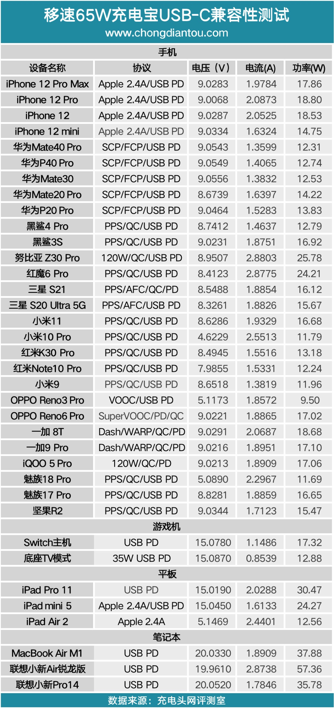 充电宝支持的协议一览。