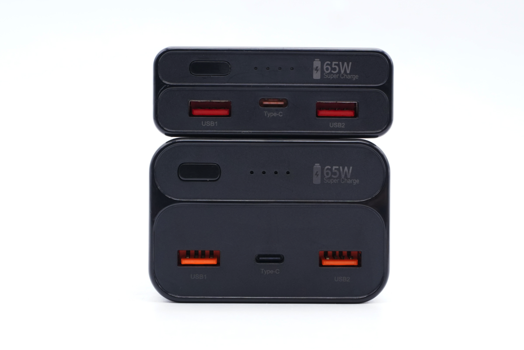 下面来看这两款充电宝,接口配置上均采用了1C2A的设计,单输入三输出。性能方面USB-C支持65W的输出功率,可以为笔记本电脑充电,USB-A接口支持常规18W快充,其中A2口支持华为4.5V5A和5V4.5A低压大电流充电。
